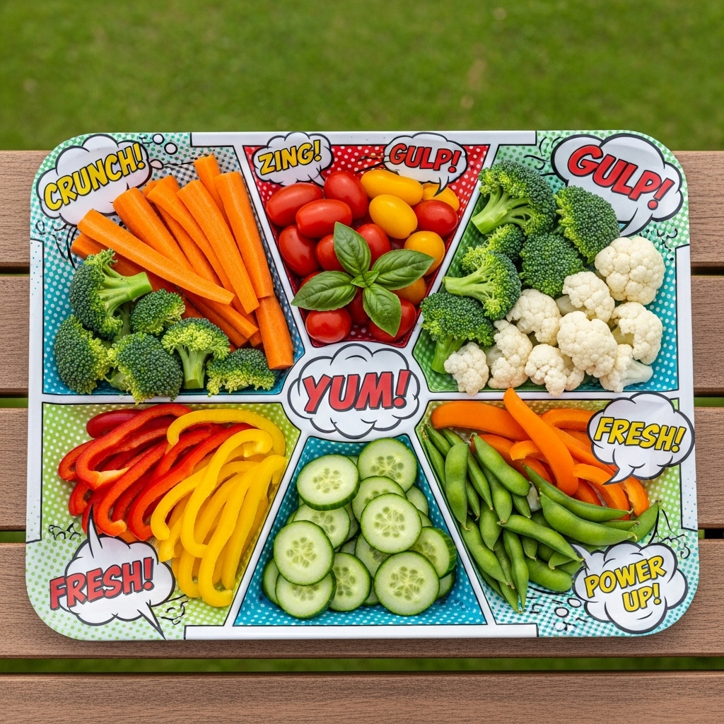 A1: Imagine your favorite comic book, broken into brightly colored panels-only instead of ink and paper, each panel features vibrant, fresh vegetables artfully arranged on a platter. It’s a fun, visual way to enjoy an assortment of healthy veggies, turning snack time into a playful, nutritious adventure.