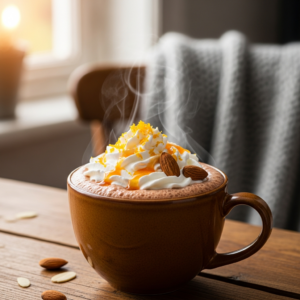 - Serve and garnish: Pour into mugs, top with whipped or coconut cream, sprinkle with the remaining toasted almonds, and optionally dust with cinnamon or a light sprinkle of cayenne for a spicy citrus kick.