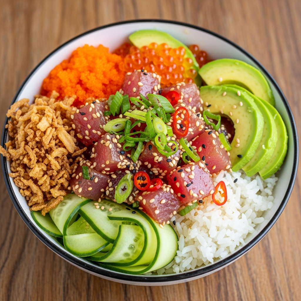 Don’t shy away from bold ingredients like crispy garlic chips, tobiko (flying fish roe), or finely julienned daikon for bursts of savoriness and texture. These additions transform a simple bowl into a gourmet experience-luxurious, colorful, and packed with varied sensations.